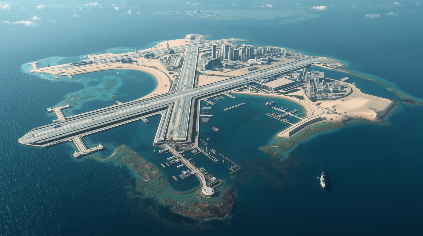 Untuk melindungi pulau dari abrasi dan gelombang laut, struktur penahan berupa batu dan beton dibangun di sekeliling daratan baru. Setelah fondasi dasar dinilai kuat, pembangunan infrastruktur pun dimulai. Dari berbagai citra satelit, terlihat jelas keberadaan landasan pacu panjang, jaringan jalan, dermaga, serta bangunan besar. Selain fasilitas yang bersifat sipil seperti mercusuar dan stasiun cuaca, juga tampak instalasi radar dan bangunan pendukung lainnya.
