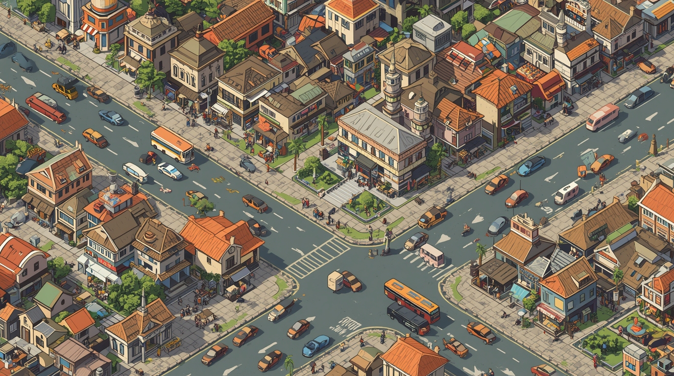Bagi pemain Indonesia, TheoTown terasa dekat dengan kehidupan sehari-hari. Banyak pemain membangun kota dengan gaya yang mirip kondisi nyata. Permukiman padat, jalan kecil, kawasan campuran antara rumah dan toko, hingga pasar tradisional sering muncul dalam kota buatan pemain lokal. Gaya bermain ini membuat TheoTown terasa lebih realistis dan mudah dipahami.